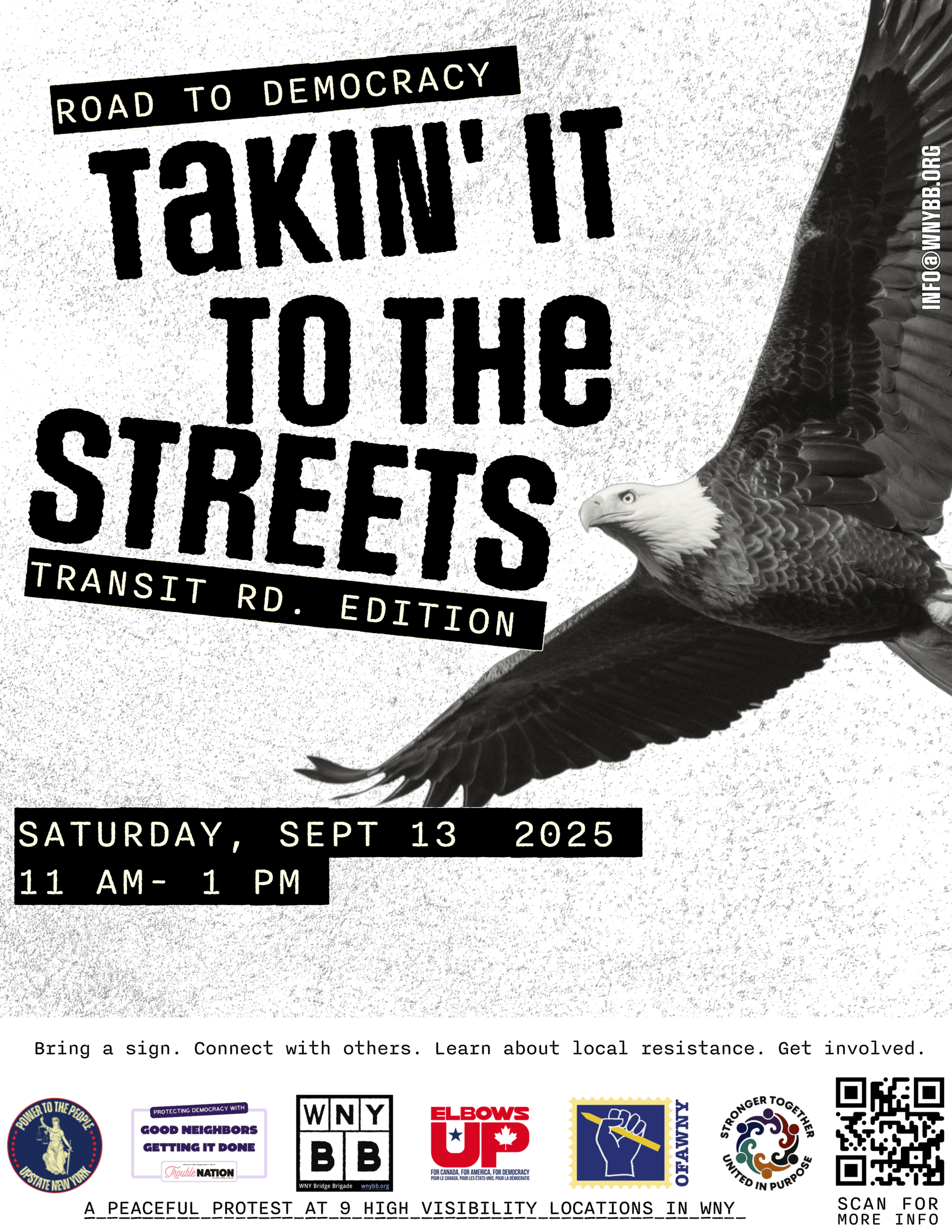 Saturday, September 13, 2025, 11am - 1pm; Road to Democracy: Takin' It to the Streets - Tranist Road Edition, with 9 mini-protests or "Hubs," 8 along Transit Road from Lockport to Elma, and a 9th Hub on Niagara Falls Blvd and Brighton. Bring signs, flags and a hearty, thick-skinned attitude as we advocate for what's right.